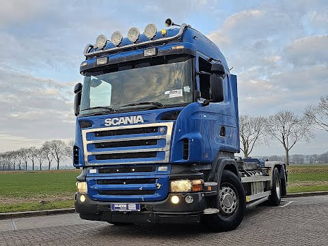 Number of axles: 3, Configuration: 6x2, Own weight: 12850 kg, Gross vehicle weight: 19000 kg, Total fuel capacity: 500 litre, Trailer coupling, Kingpin size: 40 DIN, fifth-wheel: Fixed, Diff. locks: 1, Aluminium rims, Central lubrication, Cabin type: Sleeping cabin, Cruise control, Tacho, Airconditioning, Parking heater, Electric windows, Electric mirrors, Color: Blue, Heated mirrors, Lighting type: Halogen lamps, Seat heating, Engine capacity: 426 Kw (571 Hp), Fuel type: diesel, Gearbox kind: Opti-cruise, Gearbox make: Scania, Number of Gears: 12, Clutch Pedal, Add. break system, Retarder make: Scania, Power steering, ABS, ASR, PTO, PTO type: 1, Starter battery, Matr. year superstructure: 2005, Systemlength: 542 cm, Pump, Hook-lift height: 143, Central locking, Seats configuration: 1+1, Seat cover: cloth, Chair adjustment: Manually